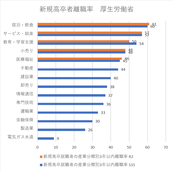 それ以降は、離職率の上位5位までしか発表されていませんが、最新の令和2年度のデータを見ると、傾向は以前とほとんど変わっていないことが分かります。